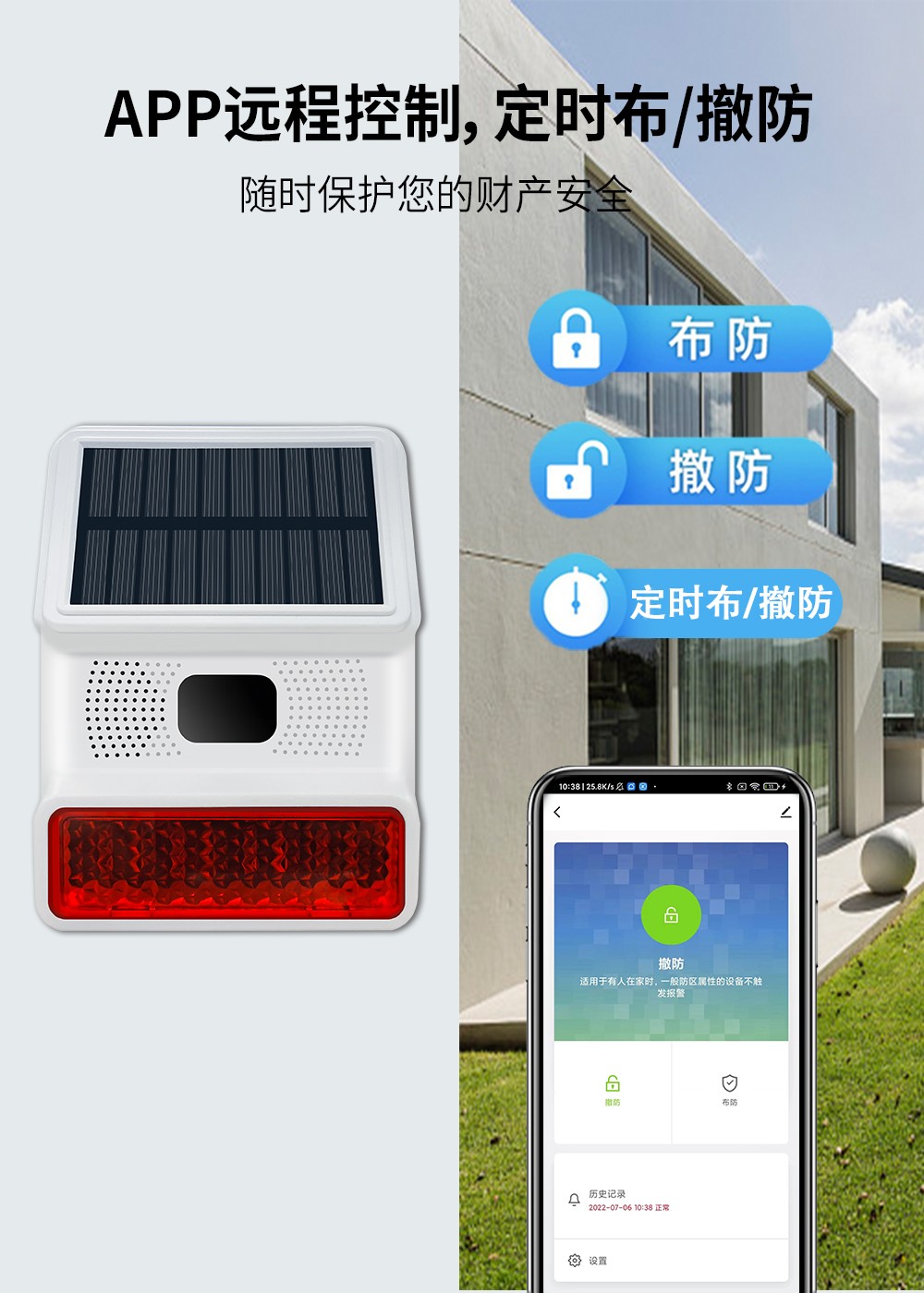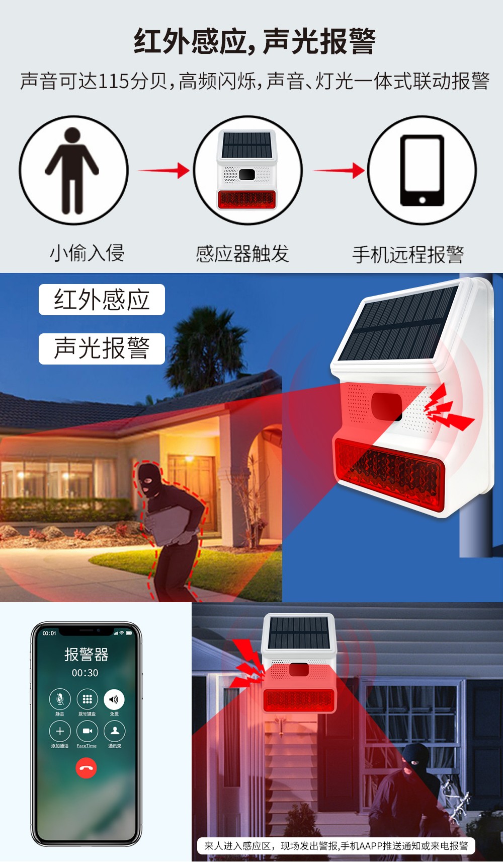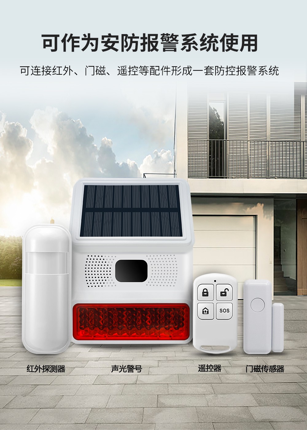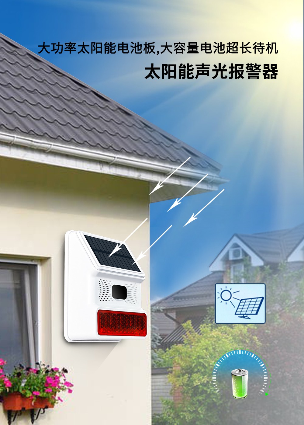 無線太陽能紅外聲光報(bào)警器分為聯(lián)網(wǎng)型和RF型,探測距離8-12米,角度110度,這是一款可以自定義報(bào)警語音,高性能的帶太陽能充電的戶外數(shù)字被動(dòng)紅外現(xiàn)場聲光報(bào)警器。能夠有效防水、防塵、防蟲、防風(fēng)和其他戶外干擾因素。該產(chǎn)品應(yīng)用如下先進(jìn)技術(shù):超低功耗芯片技術(shù),WiFi聯(lián)網(wǎng)技術(shù),NB/4G無線通訊技術(shù),太陽能持續(xù)充電和供電,音頻和高亮度閃燈同時(shí)報(bào)警提醒。使用穩(wěn)定、性能先進(jìn)、IP-65防水的整體結(jié)構(gòu)設(shè)計(jì),可以應(yīng)用于商鋪、別墅、養(yǎng)殖場、森林防火、高壓電桿、公園、倉庫、碼頭等一切需要現(xiàn)場語音和強(qiáng)光警示的地方。